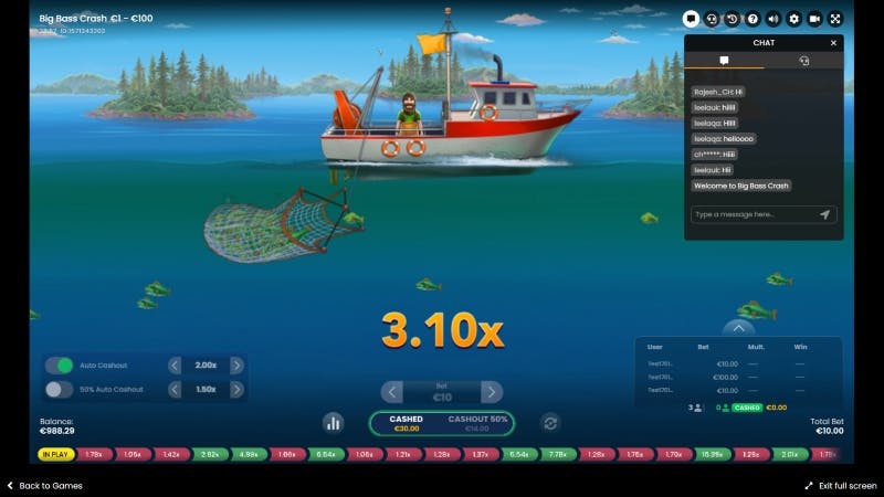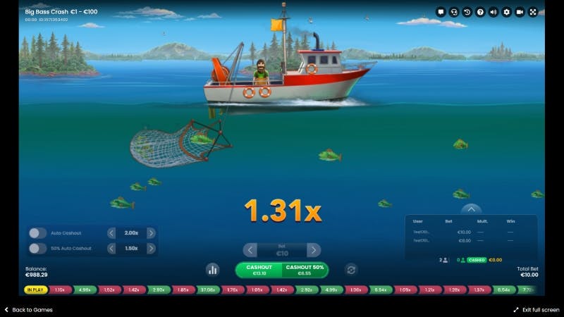 Os jogadores podem apostar qualquer quantia a partir de 1€, até 100€. Isto eleva o prémio máximo possível para 500 000€. Embora a slot Big Bass Crash não tenha um nível de volatilidade fixo, o jogo torna-se mais arriscado à medida que avança, relativamente ao tamanho da sua aposta.