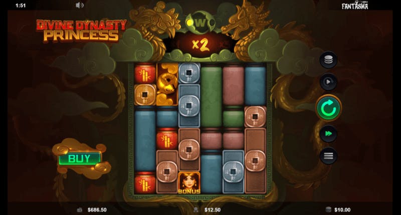 Como já deve ter adivinhado nesta análise da Divine Dynasty Princess, as características e a jogabilidade são bastante normais. Basta iniciar o jogo, selecionar o tamanho da sua aposta e premir o botão da seta verde para girar.