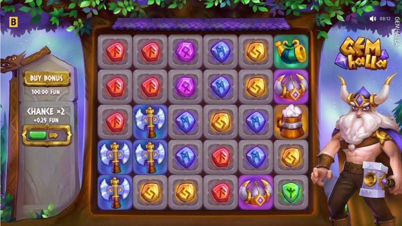 Em Gemhalla, vê uma grelha de 6×5 cheia de pedras preciosas e artefactos Viking, enquanto o Viking vigia o jogo, pronto a derrubar multiplicadores com o seu martelo.