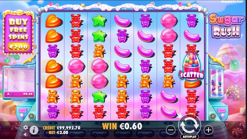 Em termos de RTP, a slot Sugar Rush está acima da média, com 96,50%. Existe também uma elevada volatilidade. Isto significa que pode ter de esperar algum tempo para ganhar, mas quando isso acontece, as vitórias tendem a ser de nível mais elevado. Isto atrairá os jogadores que gostam de correr riscos, uma vez que as recompensas podem ser substanciais.