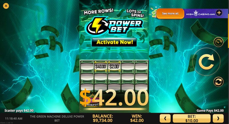 O RTP da slot The Green Machine Deluxe: Power Bet varia. O jogo base é de 95,00%, mas aumenta até 96,50%, dependendo das definições de Power Bet que escolher.