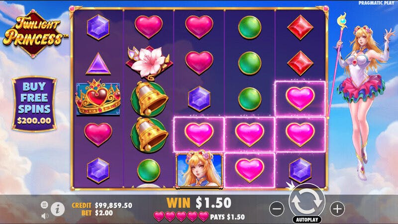 A slot Twilight Princess da Pragmatic Play passa-se no alto do céu, num reino de fantasia onde a personagem principal governa. Ela é vista a levitar à direita da grelha de rolos predominantemente roxa, empunhando um bastão mágico com o qual aumenta as suas recompensas.