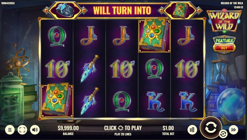 A slot machine Wizard of the Wild tem um livro de feitiços que funciona como Wild. Cada vez que um jogador gira, um símbolo aleatório aparece na barra de feitiços acima da grelha. Digamos que o símbolo é um 10. Se aparecer um 10, este transformar-se-á no livro de feitiços selvagem.